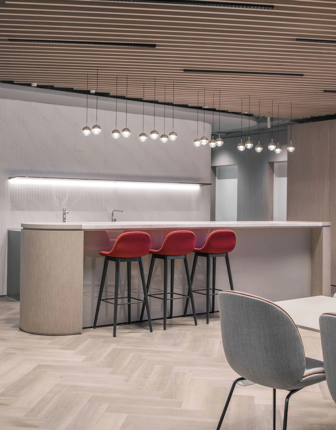 通過(guò)簡(jiǎn)約的設(shè)計(jì)風(fēng)格展現(xiàn)出了空間的高級(jí)感和品質(zhì)感,同時(shí)又不失實(shí)用性和舒適度。以中性色調(diào)為主,紅色高腳椅作為色彩點(diǎn)綴元素,為整個(gè)空間增添了一抹亮色和活力。